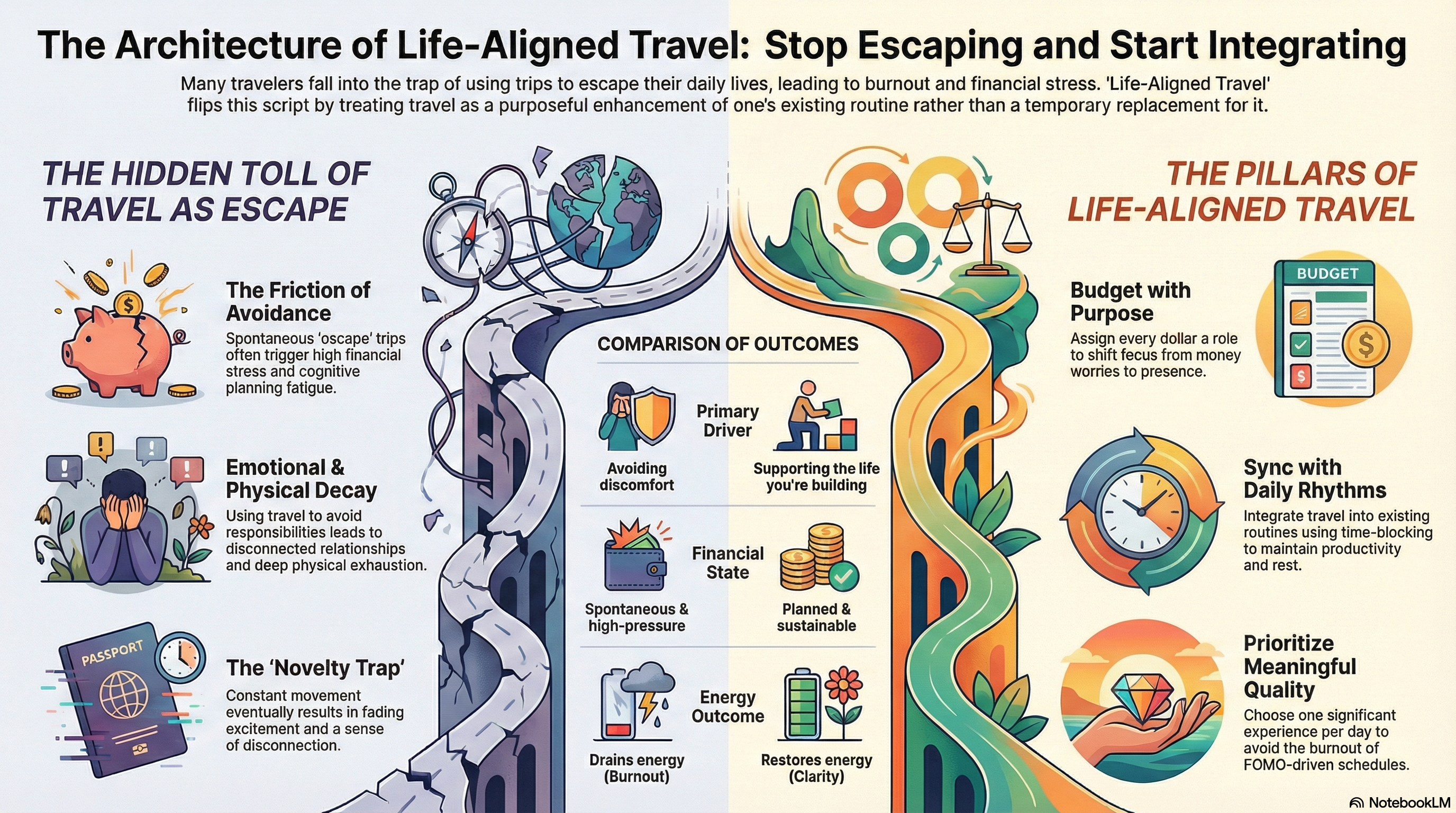 Modern travel often overstimulates instead of restoring. Without grounding, movement exhausts the nervous system. True renewal comes from contrast, not constant change. Used intentionally, travel clarifies life—it doesn’t replace it.